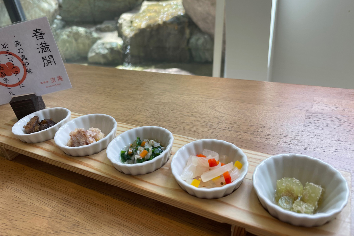 ラーメンの前菜が届きました。味の優しい野菜の総菜です。美味い。シイタケが良かった。