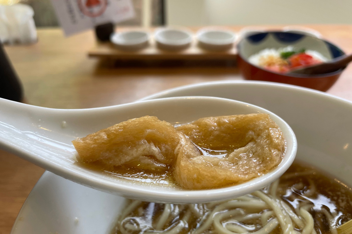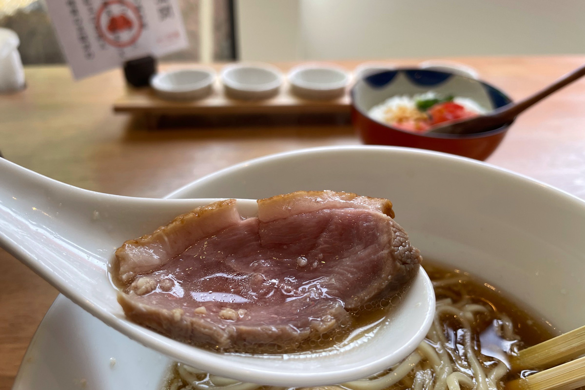 スープは油分多く、器の中に熱が閉じ込められています。旨味多い醤油ベースのスープでした。謎の粉のようなものが浮いていましたが何かわかりませんでした。
