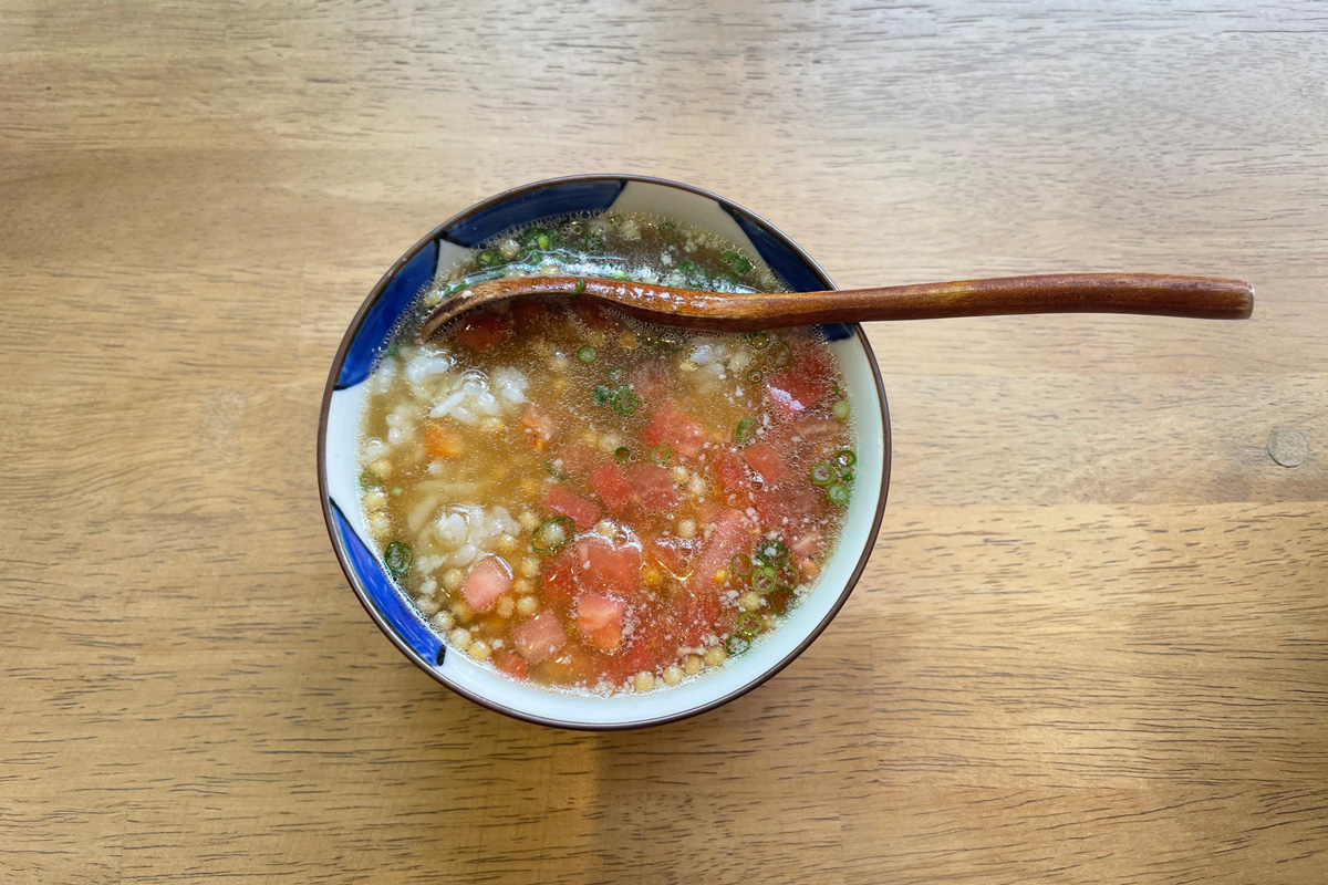 スープを沢山注ぎ込んで一口食べれば至福のひと時。トマトの酸味がスープをマイルドに和らげ、あられと葱の薬味がアクセントとなります。