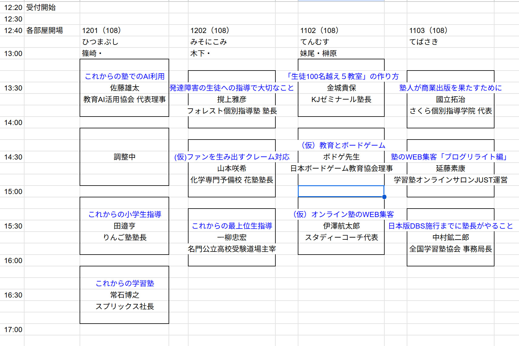 「オンラインサロンJUST」「名門公立高校受験道場」「爆裂個人塾長会議」「塾人の集い」と、各コミュニティーメンバーに登壇していただいてますし、各コミュニティーから少しずつ来てもらったら90名ってすぐじゃないかな?