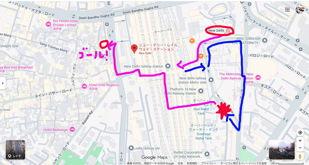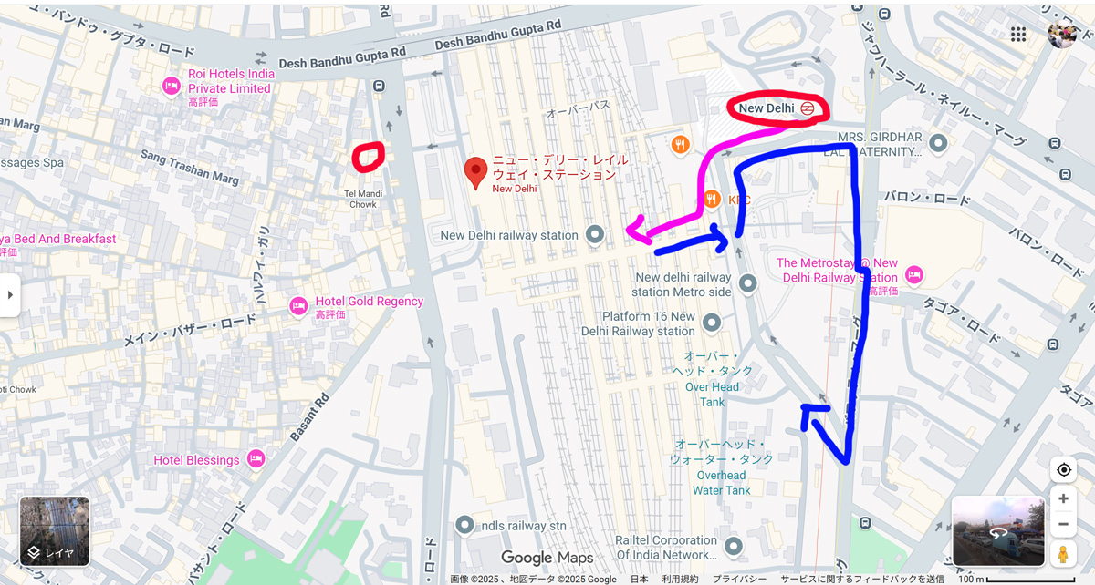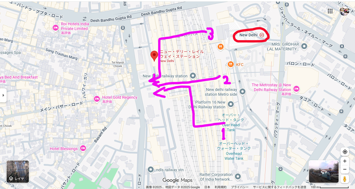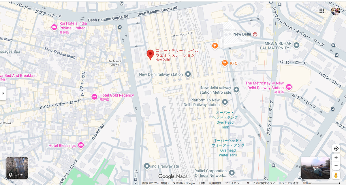 ↑こちらが現場のニューデリー駅です。中央に線路がたくさん見えますか?オレンジのKFCの右上に見えるニューデリーと書かれているのは地下鉄駅です。